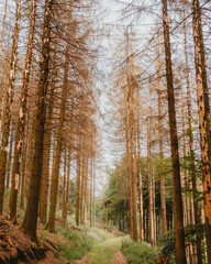 Forest track with trees in mist
