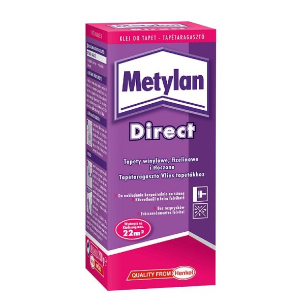 Metylan Direct  to profesjonalny klej do tapet flizelinowych, do bezpośredniego nanoszenia na ścianę. Charakteryzuje się doskonałą siłą klejenia oraz szybkością i łatwością w przygotowaniu. Produkt pochodzenia niemieckiego, wyprodukowany przez firmę HENKEL.