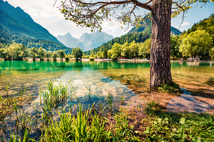 Idealny poranny widok na jezioro Jasna. Bajeczna scena letnia Alp Julijskich - #5407