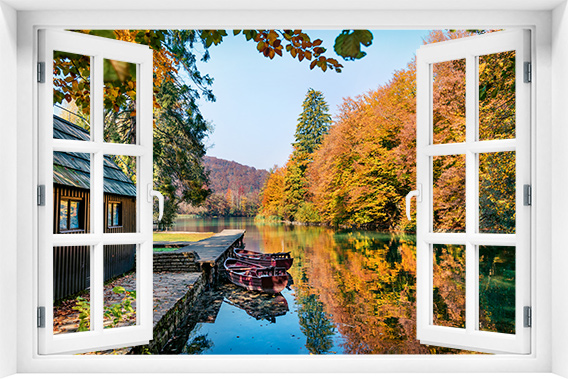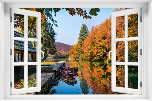 Fototapeta 3D Okno Krajobraz Jezioro Las kr-300