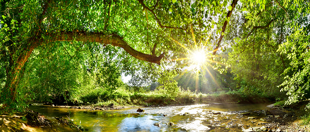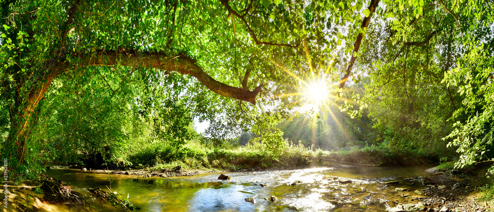 Piękna panorama lasu z słońcem wschodzącym między drzewami - #5366