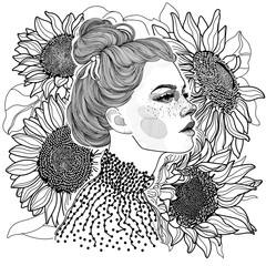 Grafika na ścianę - Kobieta i słoneczniki - #212777578v