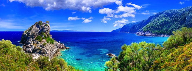 Piękna grecka wyspa - Skopelos, widok na skałę i kościół Agios Ioannis, północne Sporady - #5375