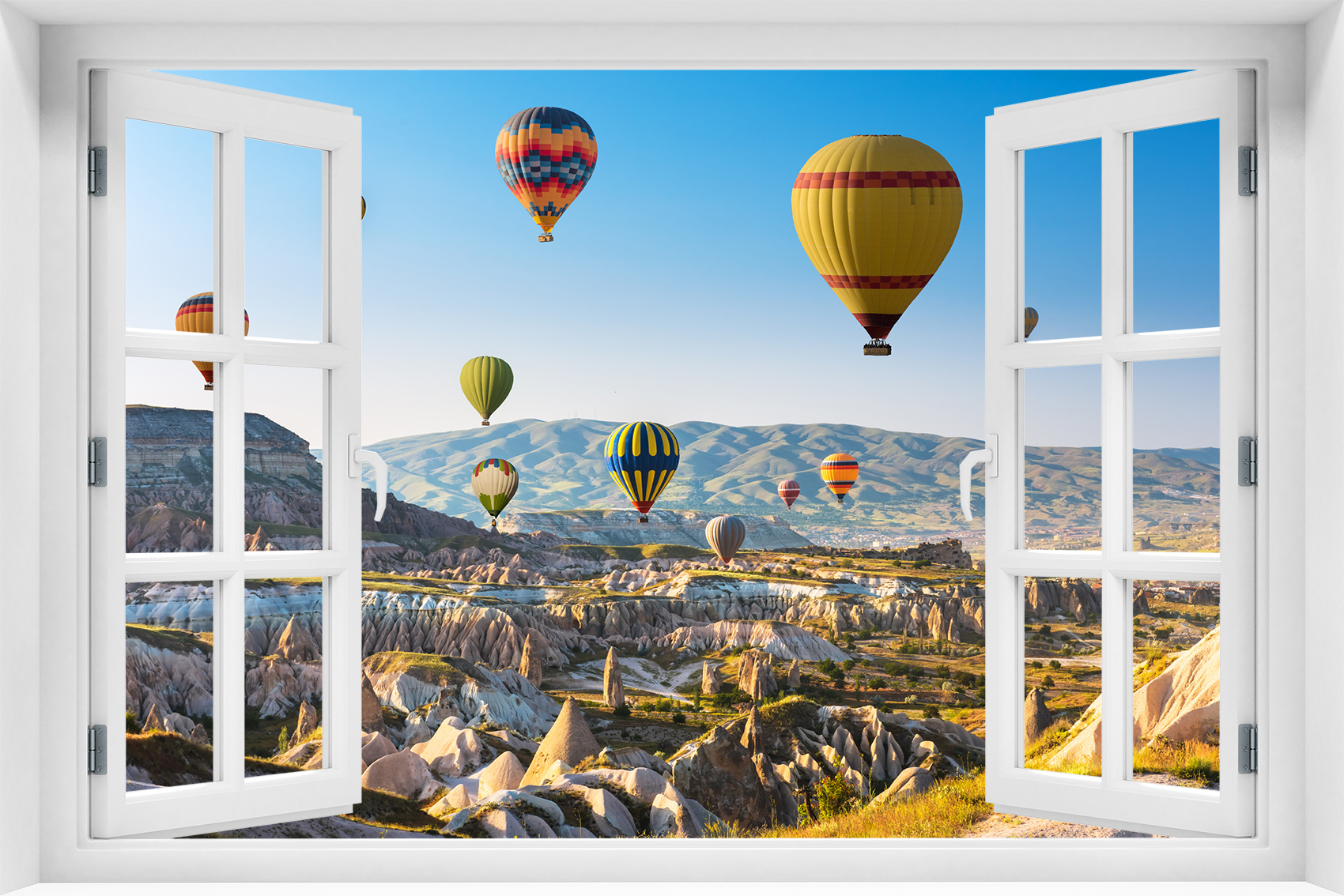 Fototapeta 3D Okno Krajobraz Góry Balony kr-459