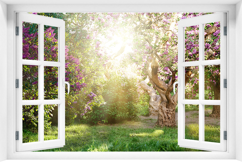 Fototapeta 3D Okno Krajobraz Kwiaty Drzewa - kr-362