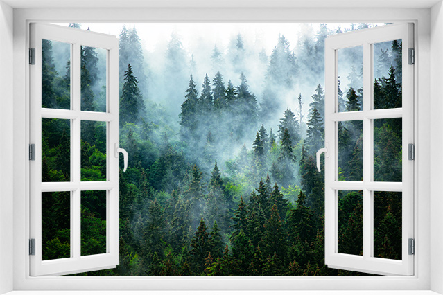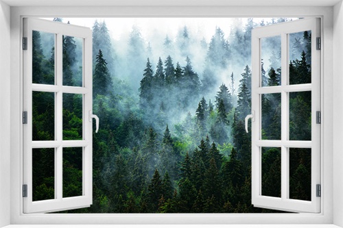 Fototapeta 3D Okno Krajobraz Las we mgle kr-279
