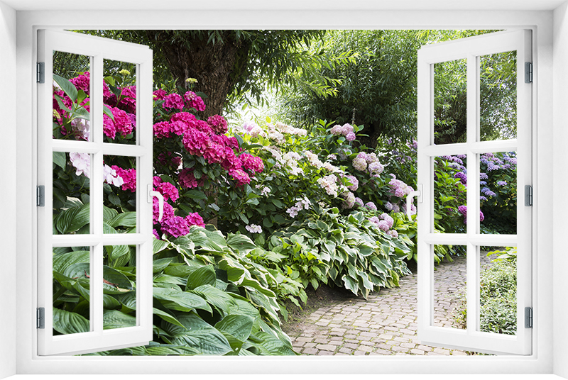 Fototapeta 3D Okno Krajobraz Kwiaty Drzewa Parki - kr-371