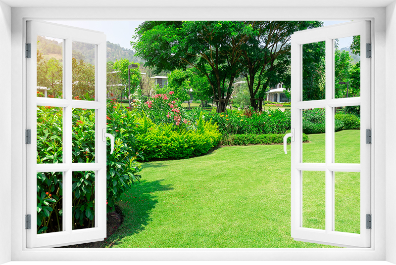 Fototapeta 3D Okno Krajobraz Kwiaty Drzewa Parki - kr-376