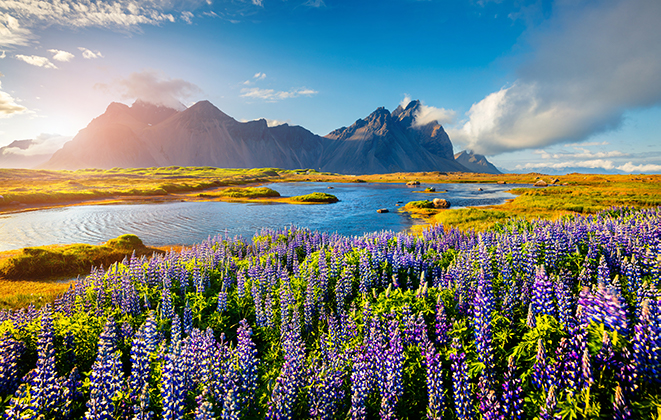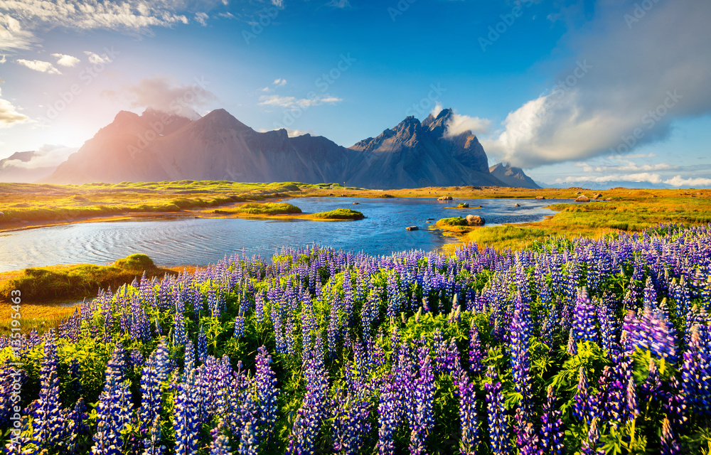 Kwitnące kwiaty łubinu na cyplu Stokksnes na południowo-wschodnim wybrzeżu Islandii - #5405