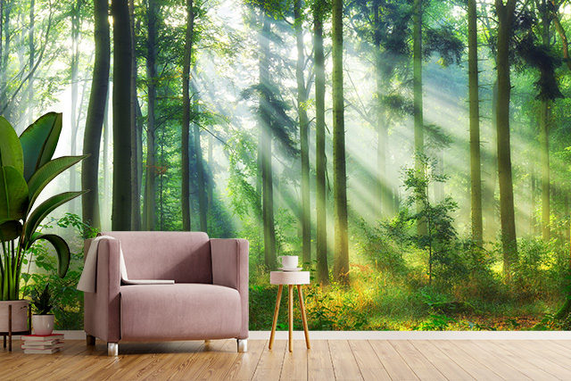 Fototapeta do salonu lub sypialni. Obraz idealnego poranka w lesie. Znakomita opcja na poprawę nastroju przy porannej kawie lub po przebudzeniu.