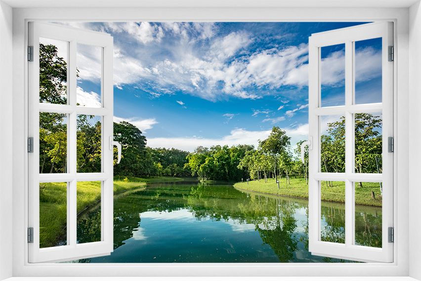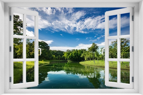 Fototapeta 3D Okno Krajobraz Rzeka Drzewa kr-328