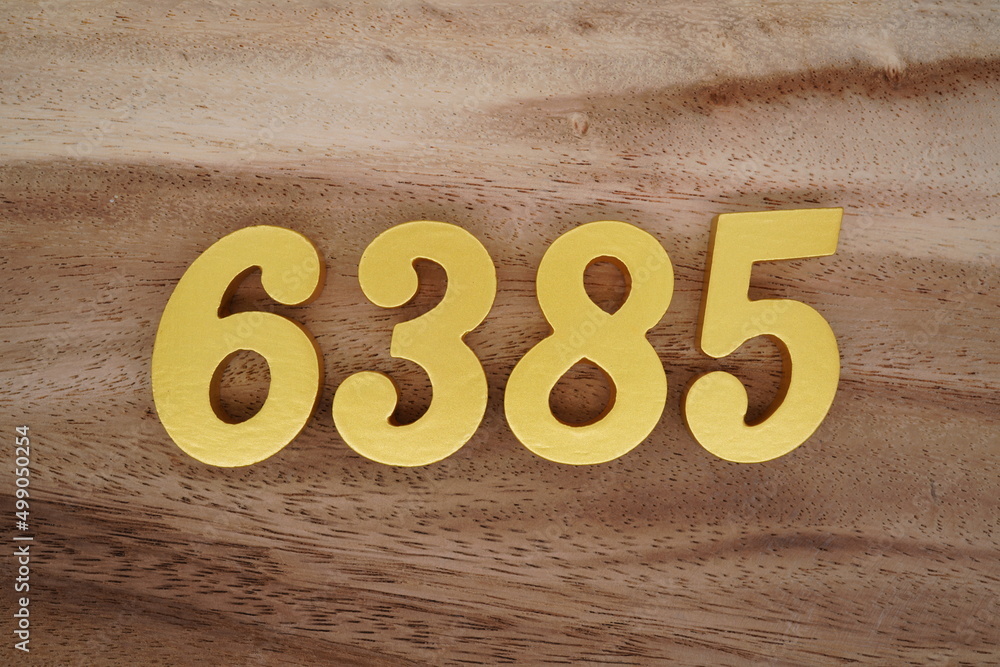 Golden Arabic numerals on a real brown and white wooden floor number 6385