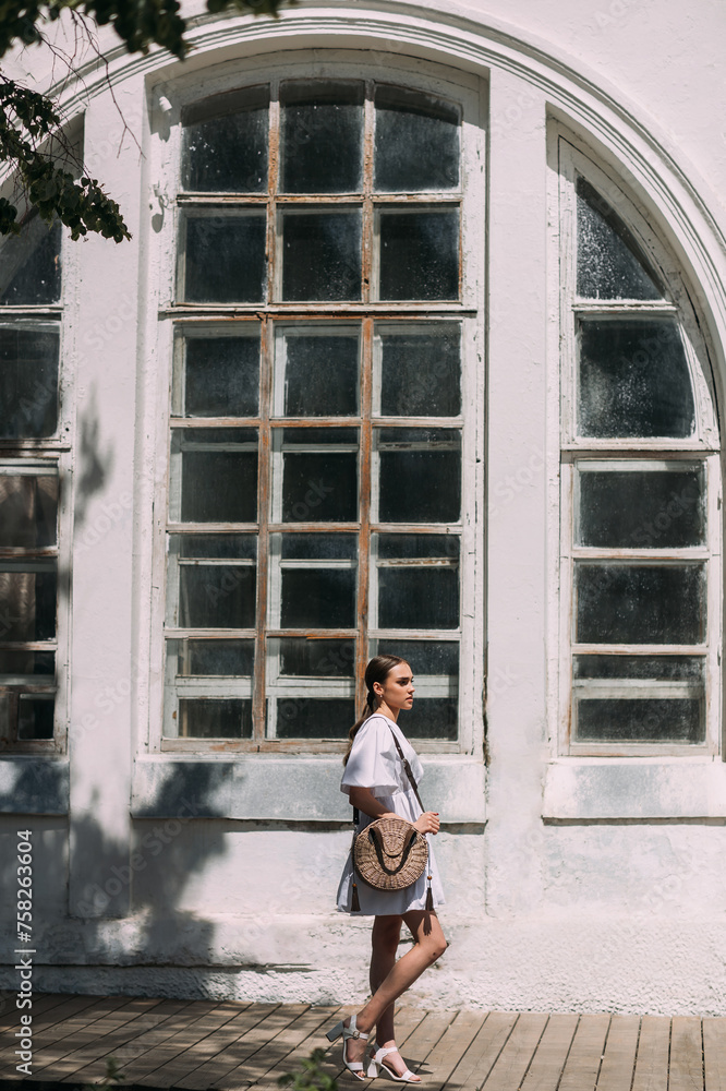 The image shows a person standing in front of a building, wearing footwear and clothing. 6391